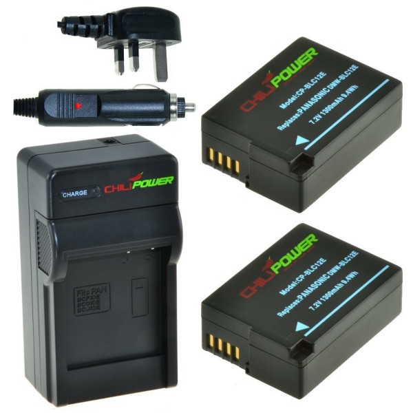 Kit complet avec 2 batteries DMW-BLC12E (1300mAh), chargeur compact et adaptateur voiture. Version UK.