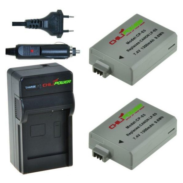 Pack avantageux comprenant 2 batteries LP-E5 (1300mAh) et un chargeur compact avec adaptateur voiture.