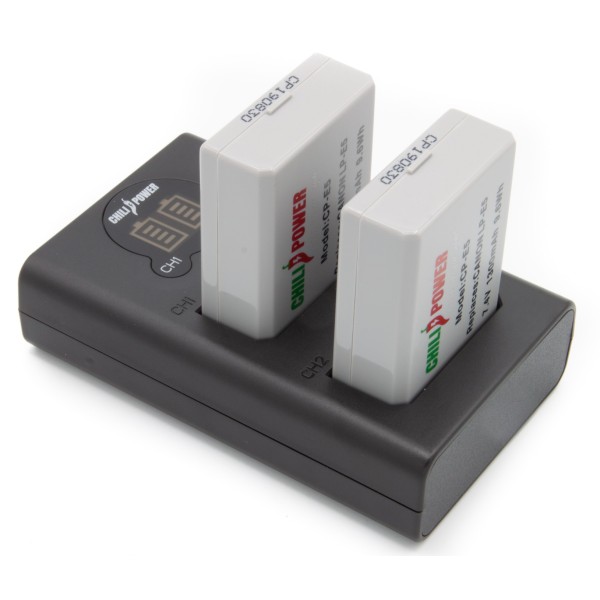 Set avantageux avec 2 batteries ChiliPower LP-E5 (1300mAh) et chargeur double USB compact.