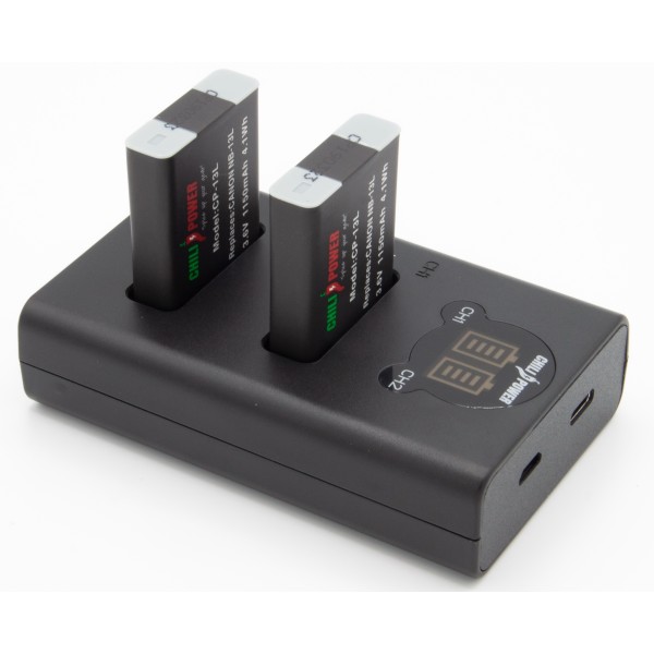 Set avantageux avec 2 batteries ChiliPower NB-13L (1150mAh) et chargeur double USB compact.