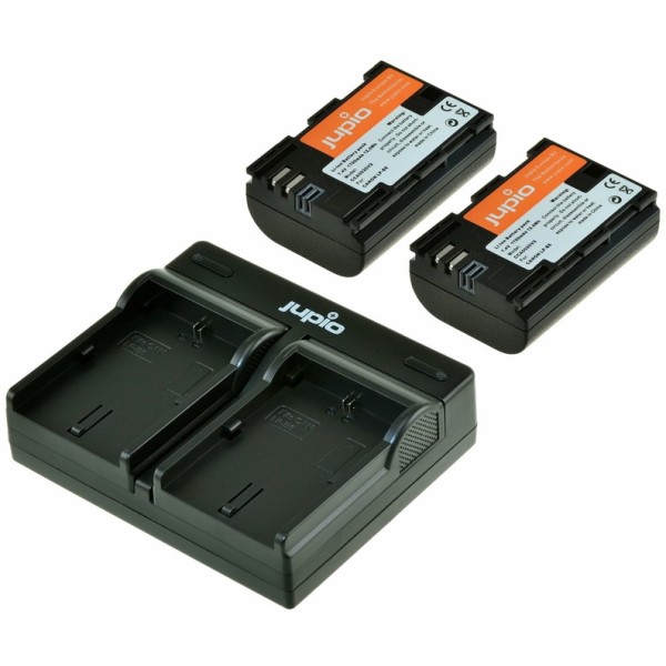 Kit avantageux Jupio avec 2 batteries LP-E6 et chargeur double léger, rechargeable via powerbank, chargeur auto, port USB ou secteur. Câble USB inclus.