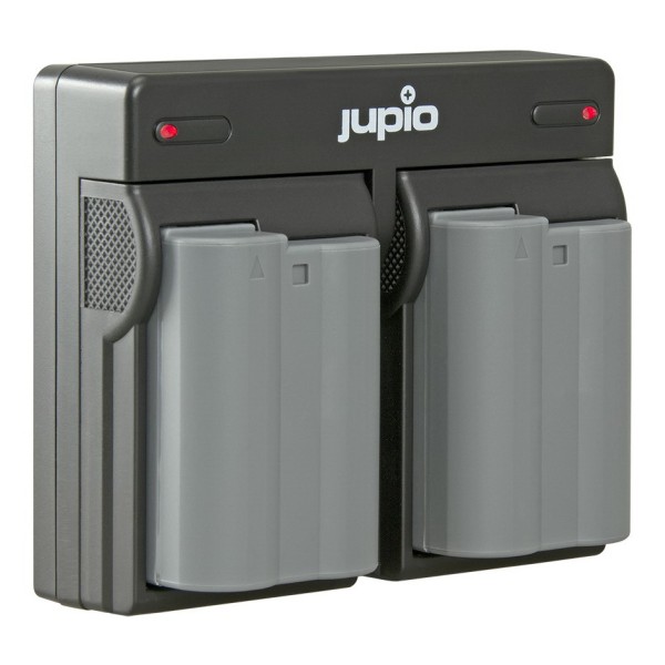 Pack Jupio avec 2 batteries EN-EL15B et chargeur double USB pour recharge flexible.