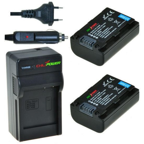 Pack avantageux comprenant 2 batteries NP-FH50 (800mAh) et un chargeur compact avec adaptateur voiture.