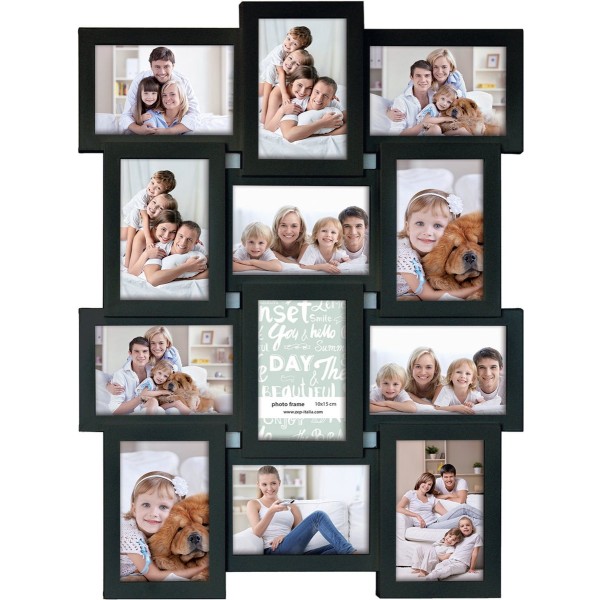 Cadre photo noir élégant pour 12 photos de 10x15 cm, design moderne et épuré, dimensions 58,5x44,5 cm