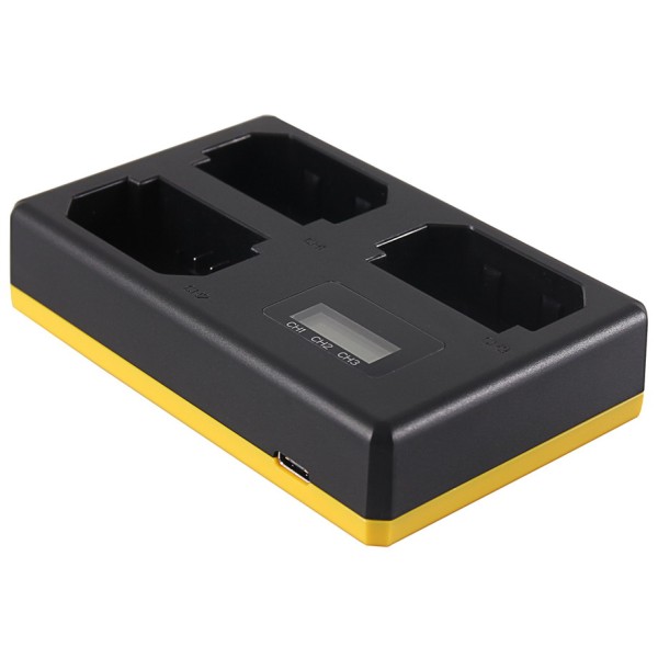 Chargeur compact pour 3 batteries NP-FZ100. Charge individuellement ou simultanément. Compatible powerbank, voiture, USB et secteur. Écran LCD de statut.
