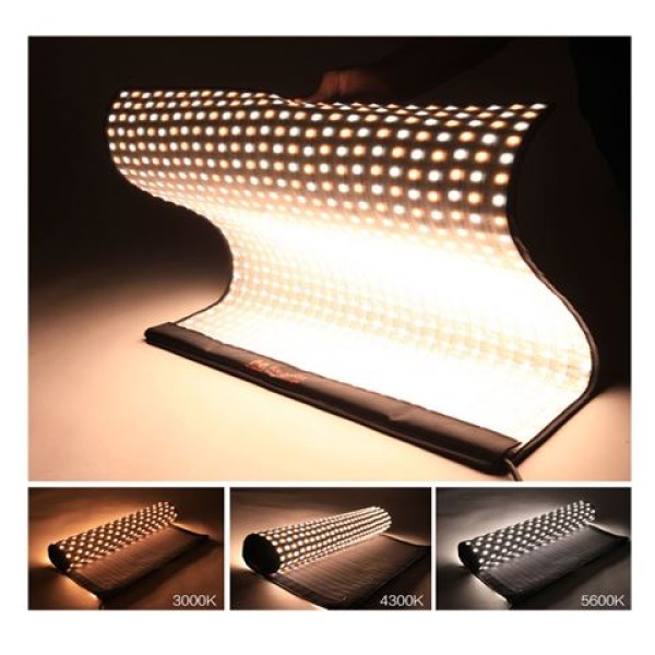 Panneau LED bi-couleur flexible 45x60cm avec 378 LEDs (150W). Température de couleur réglable 3000-5600K, CRI 95. Inclus : softbox, diffuseur et grille.