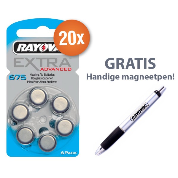 Pack économique de 20 blisters de 6 piles Rayovac type 675 (bleu) pour appareils auditifs avec stylo magnétique gratuit